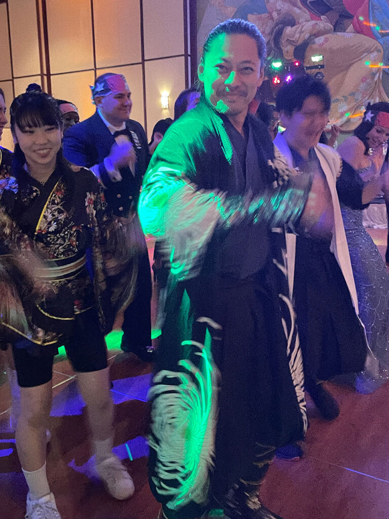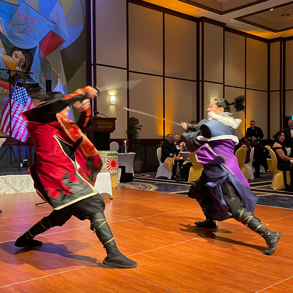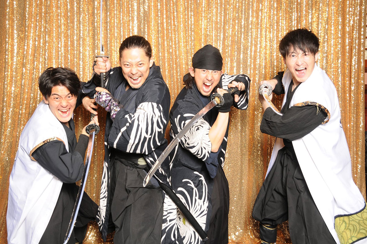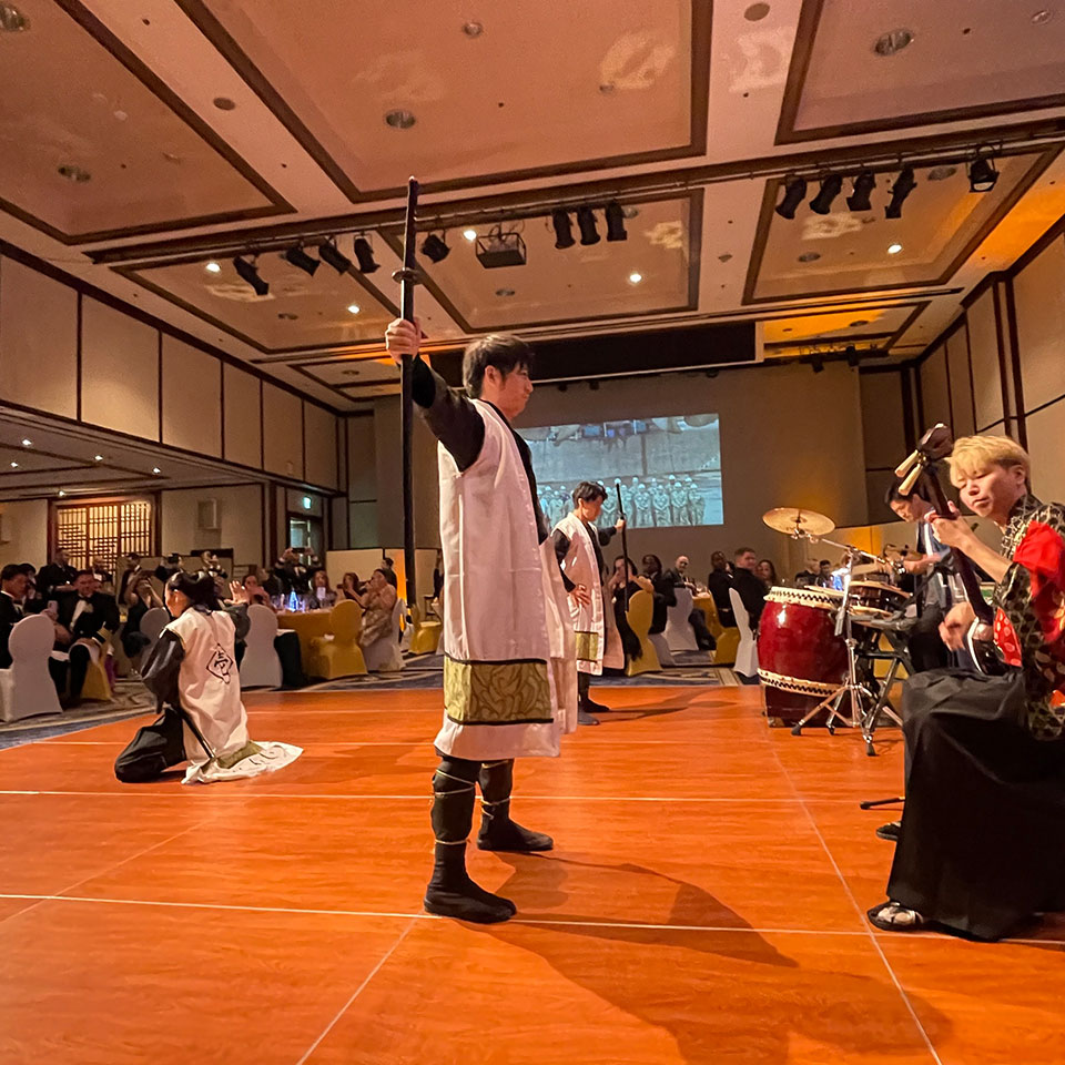 第231回のテーマは「侍」。刀屋壱は、この記念式典で侍パフォーマンスを披露させていただきました。連絡をいただいた時点で、和楽器ユニット「刃-J.I.N-」さんの出演が決まっていて、彼らの和太鼓と津軽三味線の演奏に合わせたパフォーマンスが求められたので、剣舞と殺陣をミックスしたオリジナル演目を用意しました。参加したのは、水野大、久米亮平、南翔太、神﨑飛鳥の4名。