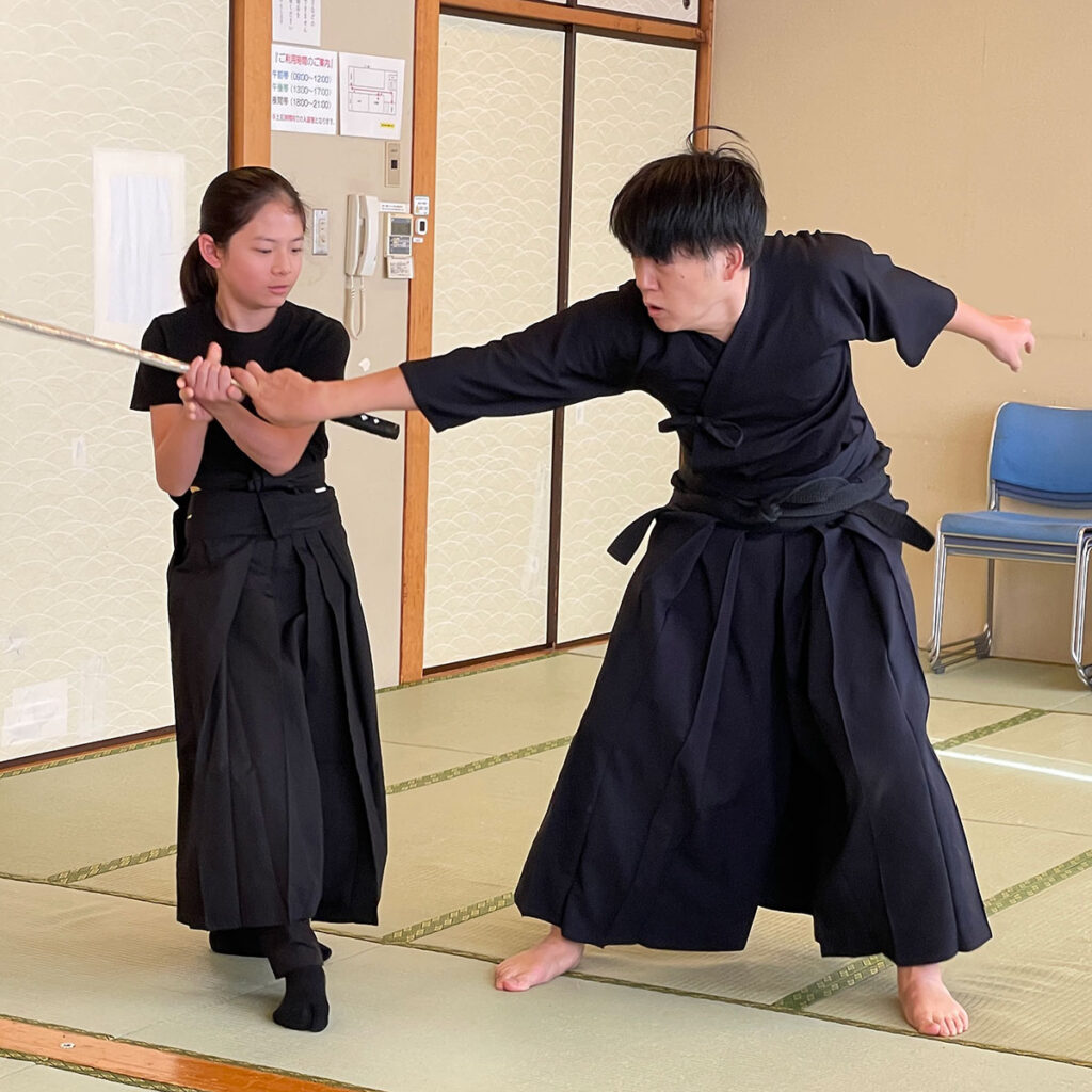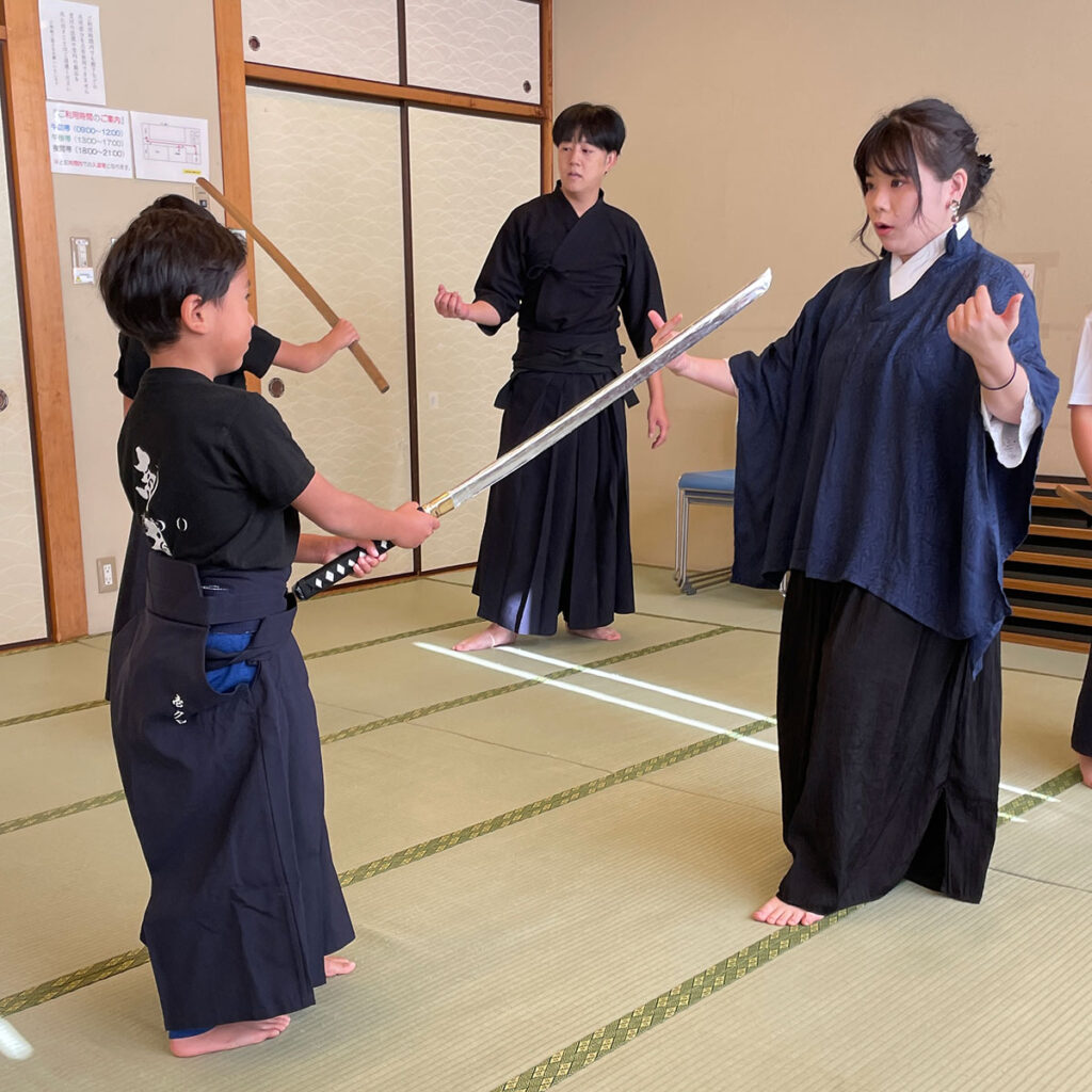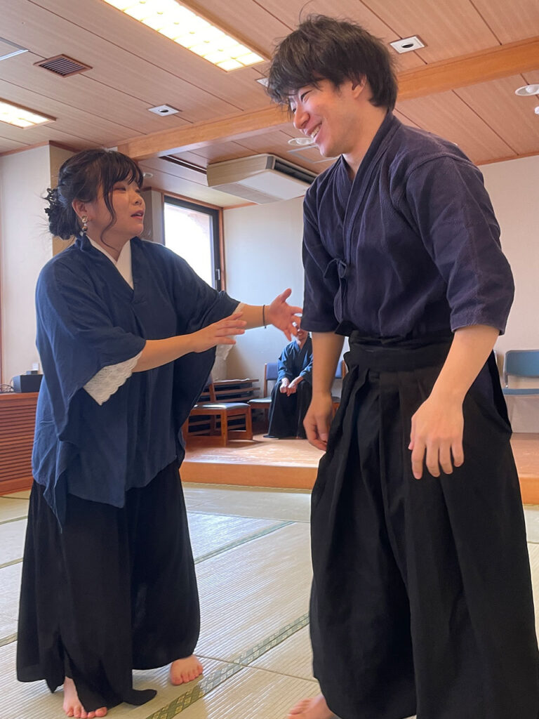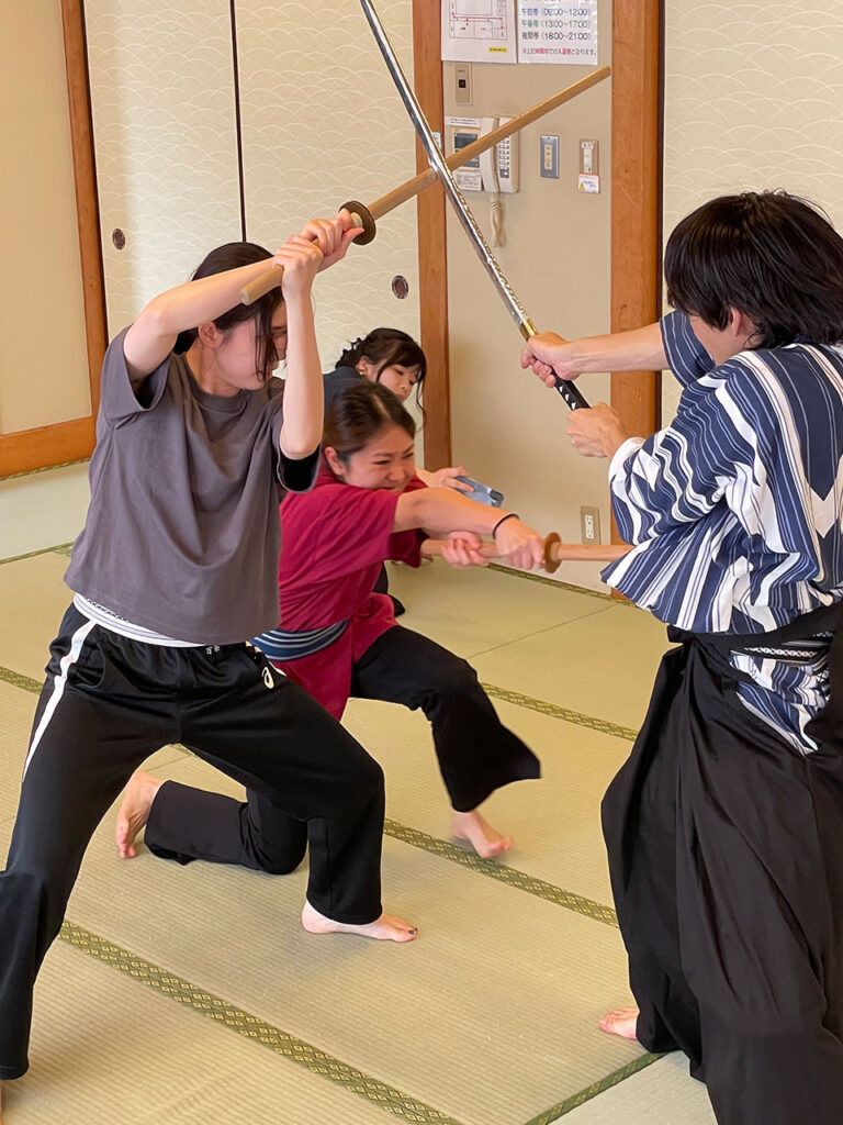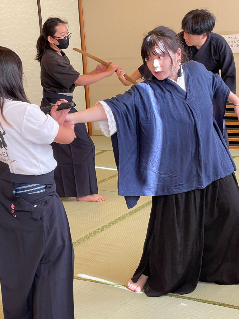 参加者に動きを理解してもらうためにアシスタントの2人がすぐ手本を示してくれて、レッスンのスピード感が素晴らしかったです。また、アシスタントは派手に倒れてくれるので、参加者も自然と上達したように感じられます。斬られ役の存在は非常に重要です。