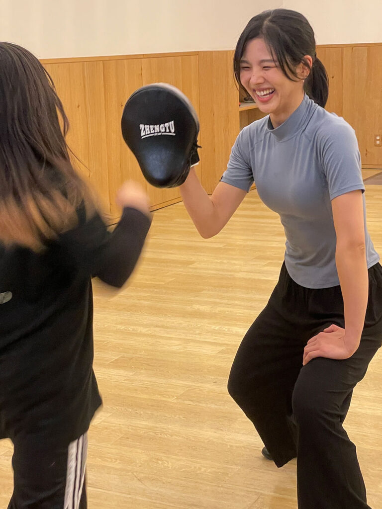 Yuriさんのパンチを間近で見た生徒が「本当に攻撃されそうで怖い」と呟いていました。怖いと感じさせるほどのリアリティをどう表現するか?その意識を大切にしているレッスンでした。