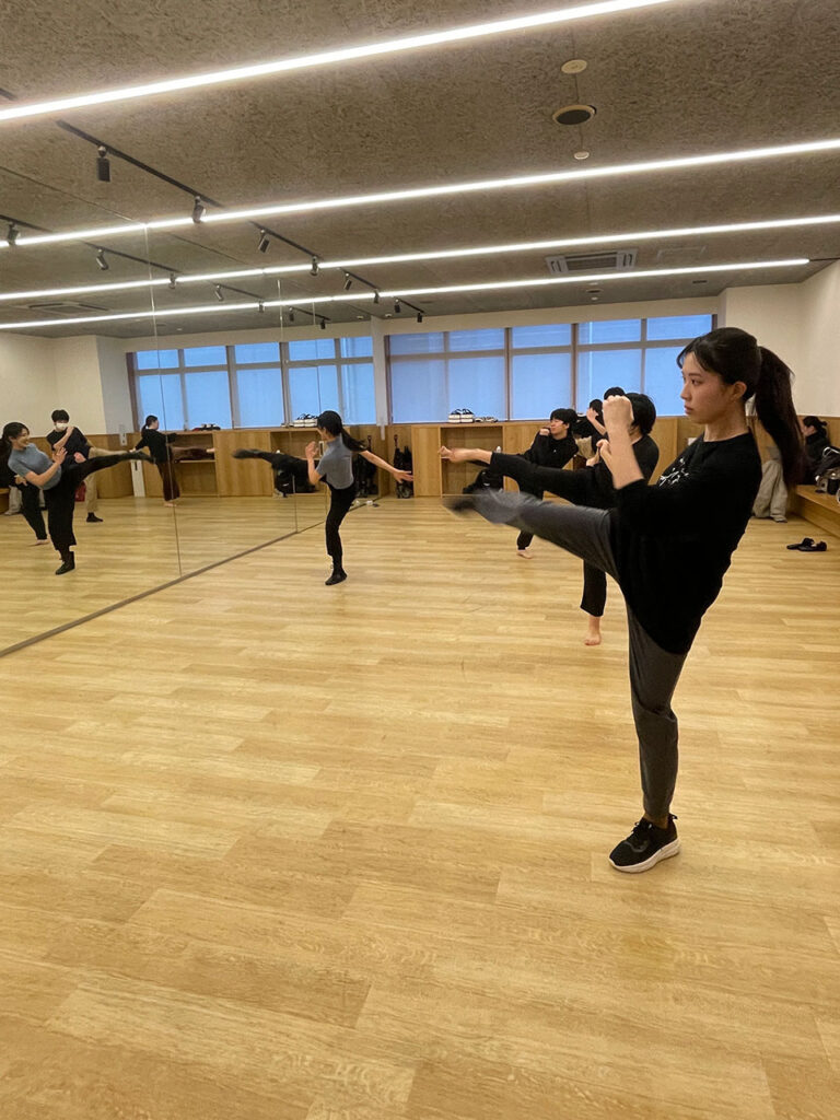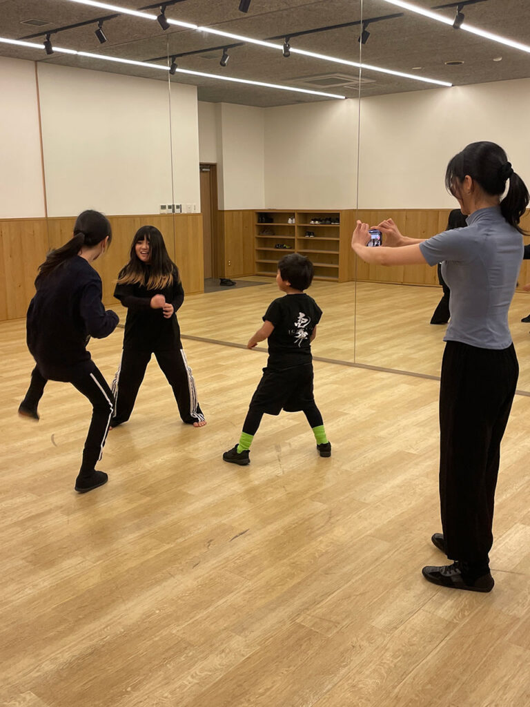 まずは 鏡を使ったシャドー。体の軸、構え、目線、力の出しどころを確認しながら、Yuriさんが 一人ずつ動きをチェックし、的確なアドバイス を入れていきます。